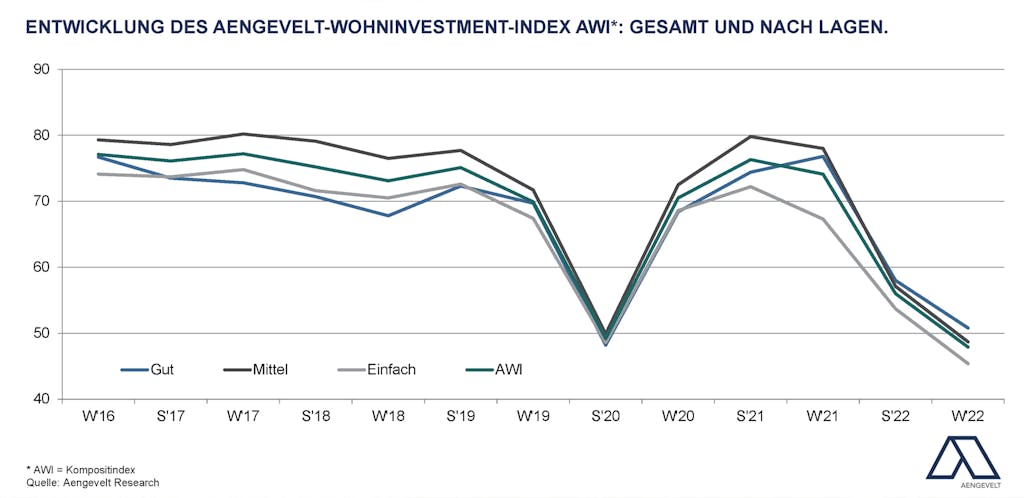 In der Sommerbefragung 2022 folgte indessen erneut ein starker Rückgang um 18,1 Punkte auf 56 Punkte. Diese Entwicklung setzte sich in der aktuellen Winterbefragung 2022/2023 fort: Der AWI gab nochmals deutlich um 8,1 auf 47,9 Punkte nach und erzielt damit das schlechteste Ergebnis seit Beginn der Befragung. Dabei vollzog sich der Rückgang über alle Wohnlagen: