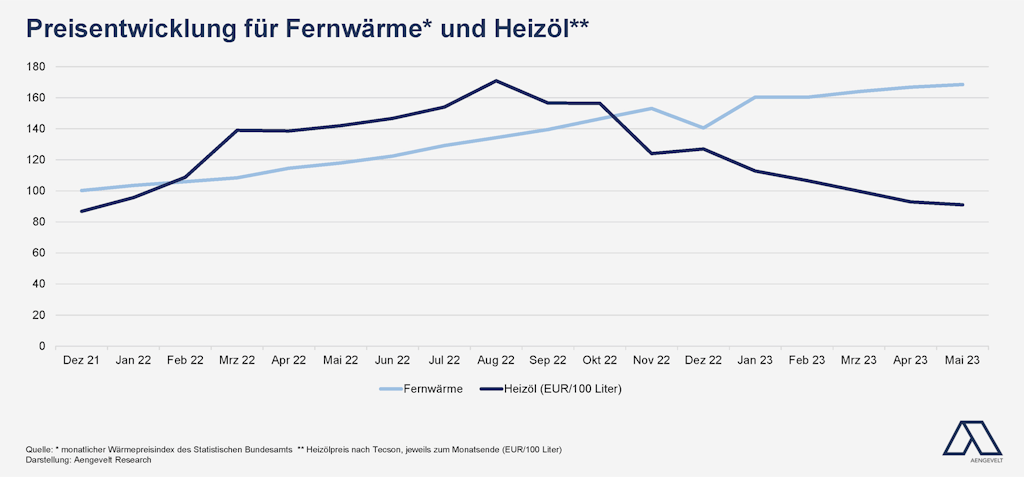 Aengevelt Research weist jedoch darauf hin, dass dadurch neue Abhängigkeiten entstehen können. Zum einen verlangen Fernwärmeanbieter z.T. sehr hohe Kosten bis in den sechsstelligen Euro-Bereich für den Anschluss eines Gebäudes an das Fernwärmenetz. Zum anderen sind Eigentümer aufgrund in der Regel langfristiger Vertragsbindungen den Fernwärmeversorgern “ausgeliefert“, da diese ihnen die Preise diktieren können.