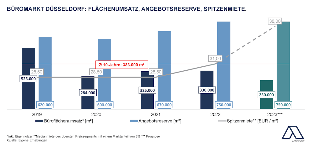 • Bei einer positiven Entwicklung mit einer einhergehenden Marktbelebung und da das zweite Halbjahr traditionell umsatzstärker ausfällt, prognostiziert Aengevelt Research für das Gesamtjahr 2023 einen Büroflächenumsatz in der Region Düsseldorf um 250.000 m², davon ca. 220.000 m² im Stadtgebiet. Dieser Wert läge etwa ein Viertel unter dem Vorjahresergebnis (2022: rd. 330.000 m²) sowie rund ein Drittel unter dem Dekadenmittel (Ø 2013 - 2022: 383.000 m² p.a.).