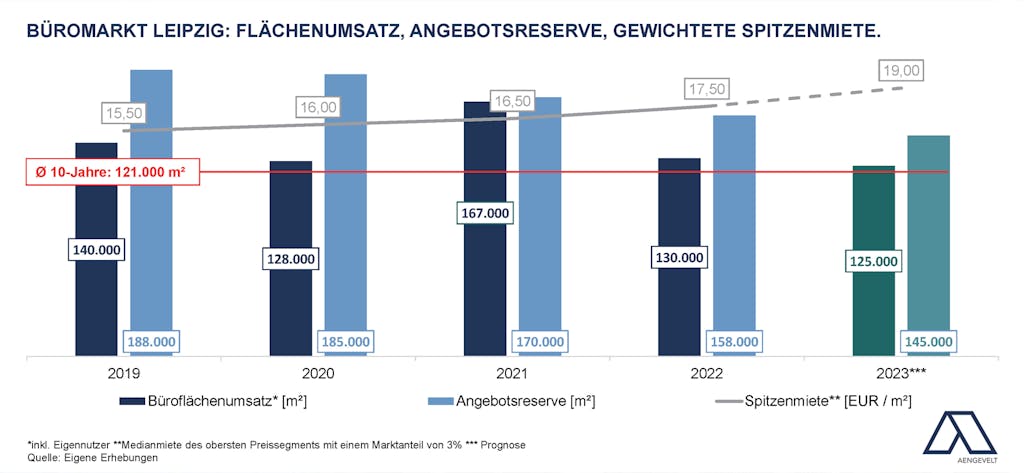 - Der Leipziger Büromarkt zeigte sich nach Analysen von Aengevelt Research in der ersten Jahreshälfte 2023 weiterhin dynamisch. Insgesamt wurden in Leipzig rd. 58.000 m² Bürofläche umgesetzt (inkl. Eigennutzer).