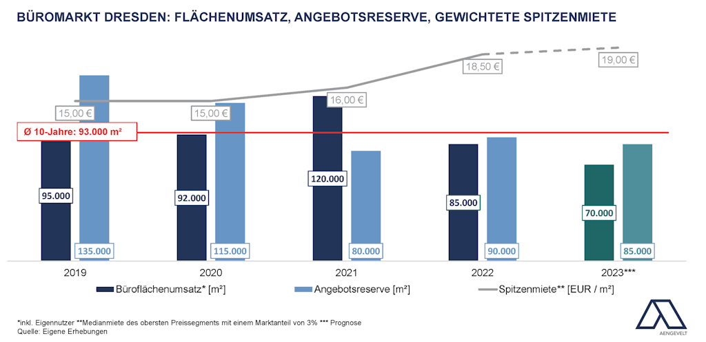 • Da das Markgeschehen am Dresdener Büromarkt synchron zu anderen Bürostandorten in der zweiten Jahreshälfte (Ø 2. Halbjahr 2013 - 2022: 61.200 m² p.a.) traditionell stärker ausfällt, prognostiziert Aengevelt Research für das Gesamtjahr 2023 einen Büroflächenumsatz um 70.000 m². Dennoch liegt dieser Wert deutlich sowohl unter dem Vorjahrsergebnis (2022: 85.000 m²) als auch deutlich unter dem Niveau des Dekadenmittels (Ø 2013 - 2022: rd. 92.700 p.a.).