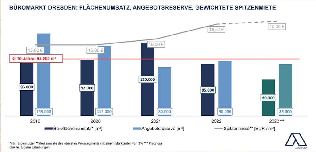 • Nach Analysen von Aengevelt Research machen sich auch auf dem Dresdener Büromarkt die aktuellen Herausforderungen wie Zinsanstiege und erschwerte Finanzierungen im Büroflächenumsatz bemerkbar. So wurden im dritten Quartal lediglich rd. 10.400 m² kontrahiert. Damit wurde das Zehnjahresmittel (Ø Q3 2013 - 2022: 19.300 m² p.a.) deutlich verfehlt, das Vorjahresquartal (Q3 2022: rd. 8.500 m²) indessen übertroffen.