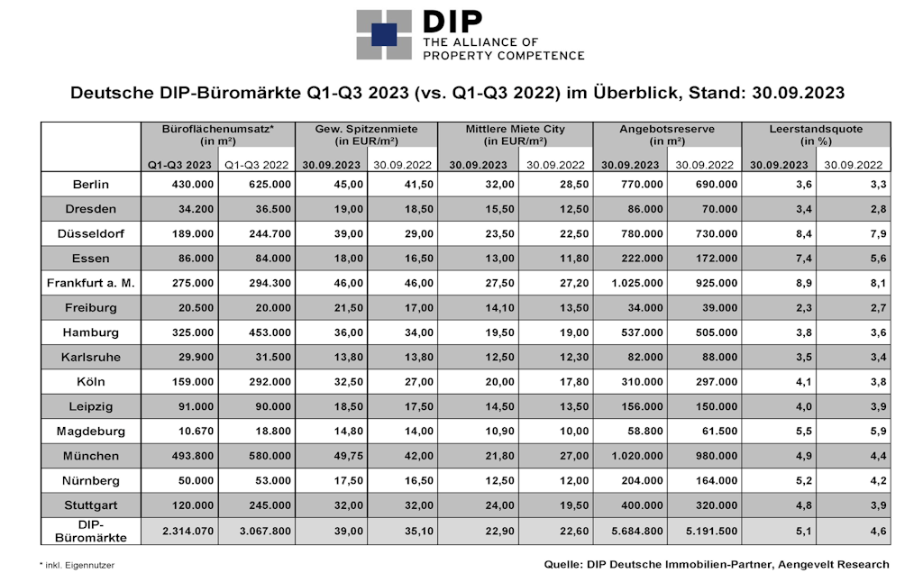 DIP-Bilanz I. -III. Quartal der deutschen Büromärkte: Geringere Dynamik.