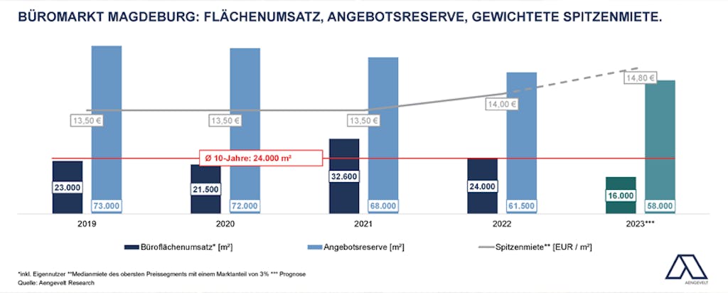 • Aengevelt Research analysiert nach einem vergleichsweise schwachen Halbjahresergebnis am Magdeburger Büromarkt (1. Halbjahr 2023: 6.200 m²) ein etwas anziehendes drittes Quartal mit einem Flächenumsatz von rd. 4.500 m², das das Vorjahresquartal (Q3 2022: rd. 4.000 m²) leicht übertrifft, das Zehnjahresmittel (Ø Q3 2013 - 2022: 5.200 m² p.a.) indessen verfehlt.