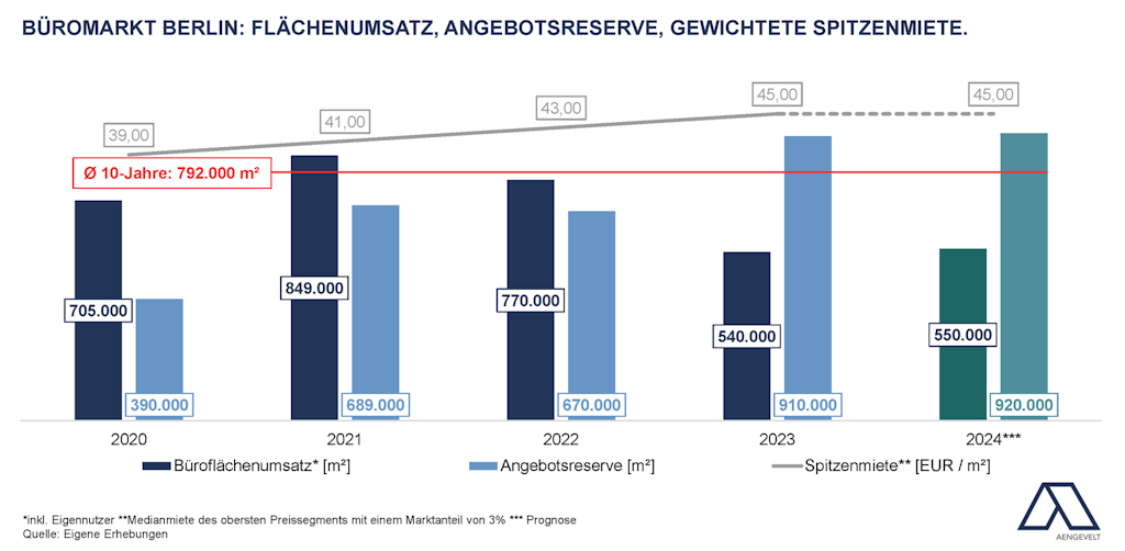 • Für das Gesamtjahr 2024 prognostiziert Aengevelt Research für Berlin einen gegenüber dem Vorjahr einen stabilen Büroflächenumsatz um 550.000 m².
