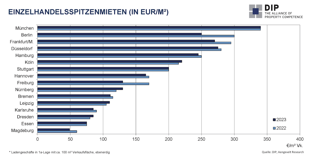 Gleichzeitig gab die über alle von DIP analysierten Standorte gemittelte Spitzenmiete leicht nach. In den Einzelmärkten gab es indessen stark differenzierte Entwicklungen.