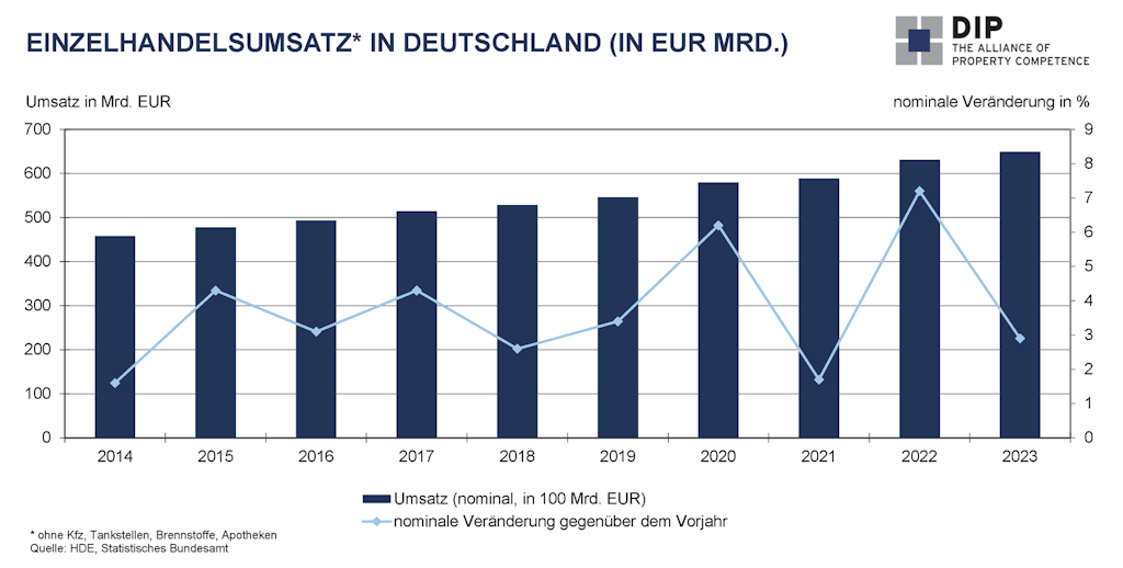 Ungeachtet dieser schwierigen Ausgangslage konnte der Einzelhandel 2023 mit etwa EUR 649 Mrd. einen neuen Rekordumsatz verbuchen. Dieses Ergebnis bedeutet nominal ein Umsatzplus von 2,9 % gegenüber 2022 (rd. EUR 631 Mrd.). Preisbereinigt liegt der reale Umsatz aufgrund der hohen Inflationsrate indessen -3,4 % unter dem Vorjahreswert.