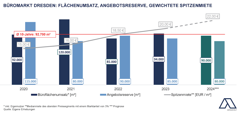 - Nach Analysen von Aengevelt Research zeigte der Büromarkt Dresden entgegen dem bundesweiten Trend 2023 eine anziehende Performance: Mit einem Büroflächenumsatz von rd. 94.000 m² (inkl. Eigennutzer) wurde das Vorjahresergebnis (2022: 85.000 m²) um 11 % übertroffen, der Mittelwert der jüngsten zehn Jahre (Ø 2013-2022: rd. 92.700 m² p.a.) um rd. 1,4 %.