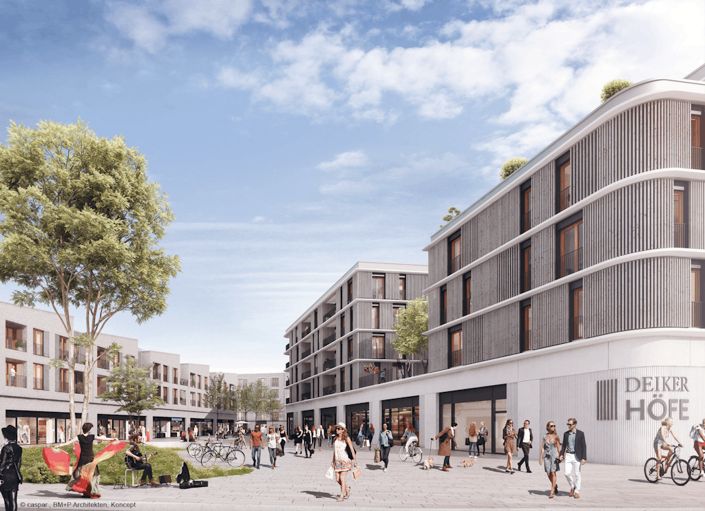 Ein Vorzeige-Beispiel für ein nutzungsgemischtes Quartier stellen die sich derzeit im Bau befindlichen “Deiker Höfe“ (siehe Bild oben) in Düsseldorf dar. Sechs Gebäude mit insgesamt 353 Wohnungen, 15.000 m² Bürofläche, 3.600 m² Einzelhandel und Gastronomie, einem Hotel mit 137 Zimmern, einer Kita mit 55 Plätzen sowie einem Netz von Ladestationen für e-Mobilität, die sich als Ensemble um gemeinsame Höfe gruppieren, schaffen ein Quartier mit eigener Identität, Synergien zwischen den Nutzungen und extrem kurzen Wegen, die das Ziel der Bürgermeisterin von Paris, Fuß- und Radwege von maximal 15 Minuten auf real 5 Minuten schrumpfen lassen.