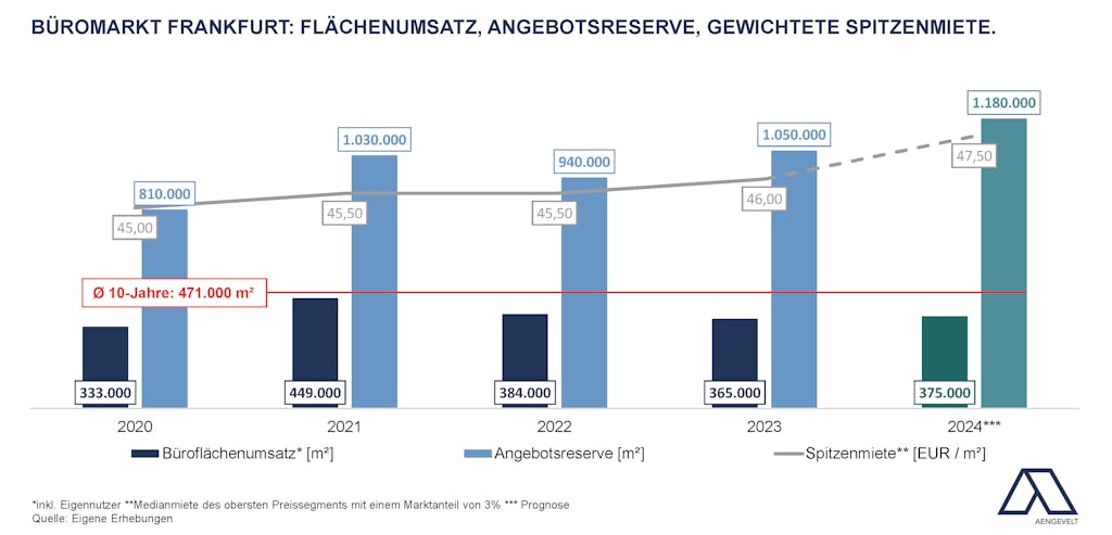 Für das Gesamtjahr 2024 prognostiziert Aengevelt für Frankfurt angesichts eines traditionell umsatzstärkeren zweiten Halbjahres einen Büroflächenumsatz um 375.000 m². Dieser Wert läge 3 % über dem Vorjahreswert (2023: rd. 365.000 m²), würde allerdings das Zehnjahresmittel um 20 % (Ø 2014 - 2023: 471.000 m² p.a.) verfehlen.