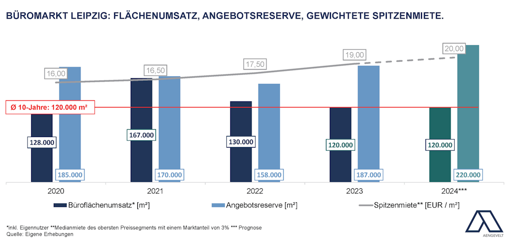 - Bis Ende 2024 prognostiziert Aengevelt Research indessen eine wieder auf rd. 220.000 m² steigende Angebotsreserve.