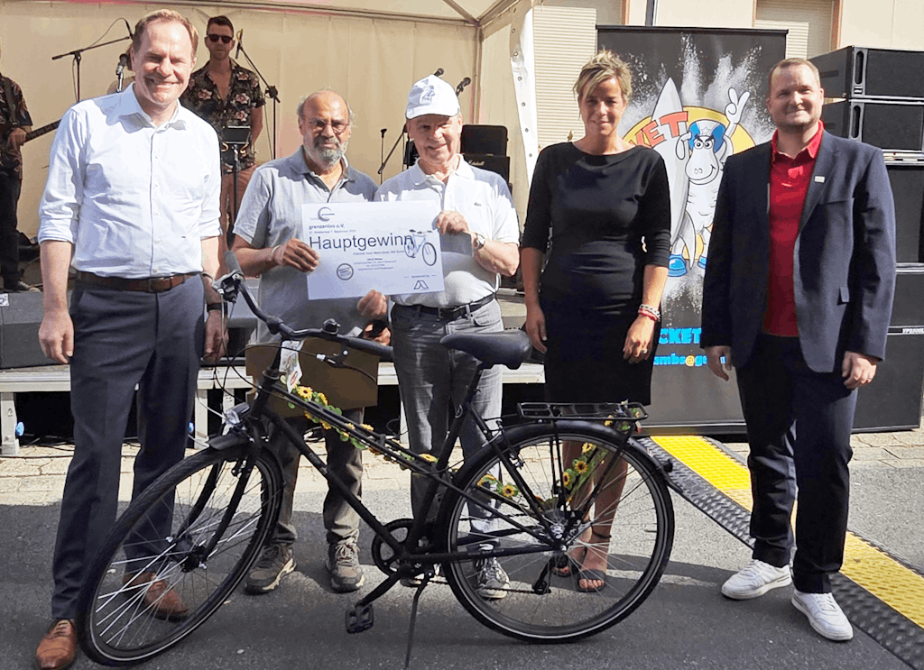Übergabe des Tombola-Hauptgewinns (von links nach rechts): Oberbürgermeister Dr. Stephan Keller, Davinder Singh, grenzenlos-Vorstandsvorsitzender, Dr. Wulff Aengevelt, NRW-Ministerin Mona Neubaur und Patrick Gorzelanczyk, Postcode Lotterie.