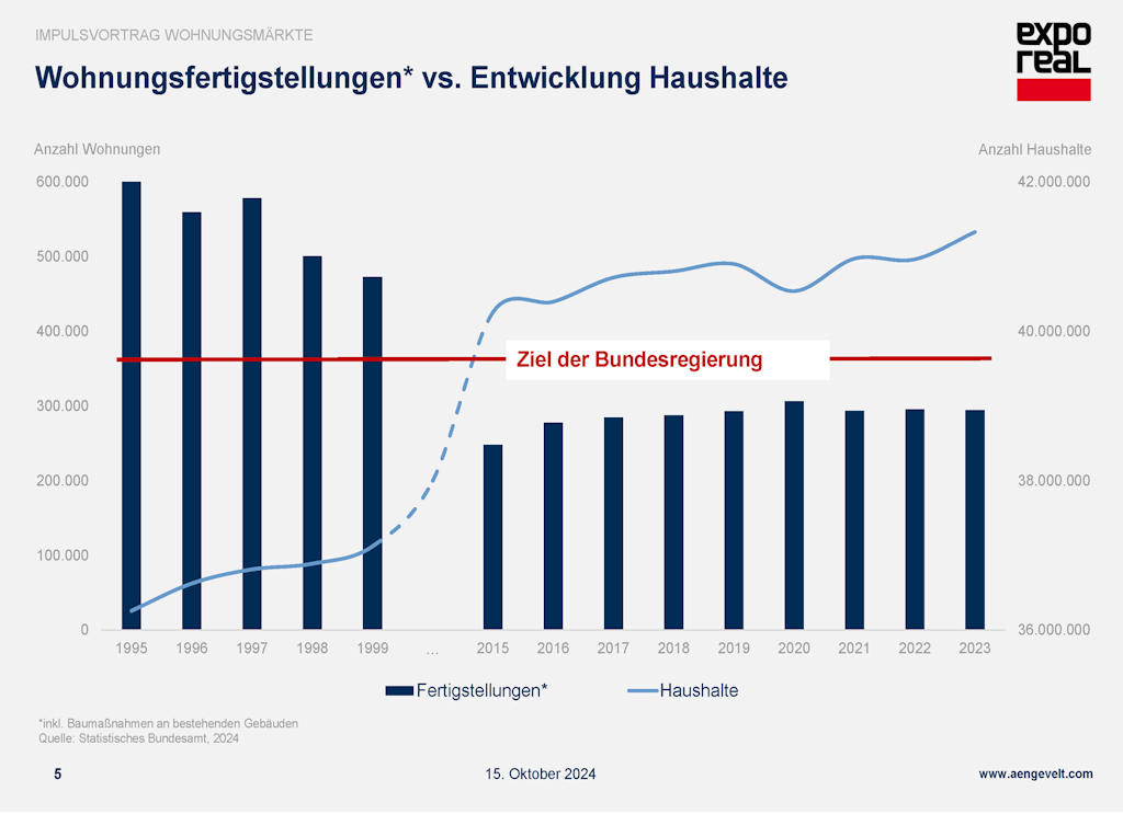 Nach Analysen von Aengevelt werden seit mittlerweile 15 Jahren in Deutschland Jahr für Jahr zu wenig Wohnungen fertiggestellt. Allein für das laufende Jahr beziffert Aengevelt Research die Wohnungsbaulücke auf 375.000 Wohneinheiten. Das bundesweit aufgelaufene Wohnungsdefizit wird, je nachdem, wie Wohnungsmangel definiert wird, auf 750.000 bis 1,9 Millionen Wohneinheiten geschätzt. Die logische Folge sind stark steigende Mietniveaus, die einen wachsenden Teil der Bevölkerung überfordern. Nach neuesten Erkenntnissen droht die Gefahr, dass die chronische Wohnungsbaulücke den sozialen Frieden stark gefährdet und so die politische Radikalisierung begünstigt.