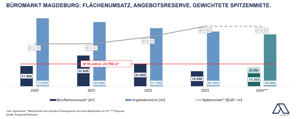 - Aengevelt Research analysiert nach einem vergleichsweise schwachen Halbjahresergebnis am Magdeburger Büromarkt (1. Halbjahr 2024: 6.100 m²) ein weiterhin verhaltenes drittes Quartal mit einem Flächenumsatz von rd. 2.000 m², dass unter dem Vorjahresquartal (Q3 2023: rd. 4.500 m²) bleibt und auch das Zehnjahresmittel (Ø Q3 2014 - 2023: 5.200 m² p.a.) verfehlt.