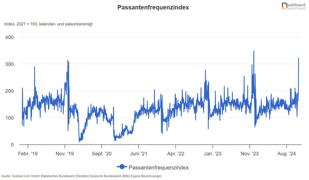 Aengevelt verweist aber auch auf eine Gegenentwicklung, die sich geradezu komplementär zur Digitalisierung des Einzelhandels ereignet. Das Statistische Bundesamt vermeldet dazu Erstaunliches: Am 1. Dezember 2024 sprang der Passantenfrequenzindex, der Daten aus 21 deutschen Großstädten auswertet, auf einen Wert von 321,7 Punkten, der sogar die Spitzenwerte des Vor-Corona-Jahres 2019 übertrifft. Zum Vergleich: 100 Punkte stellten den Mittelwert des Jahres 2021 dar, und ein Indexwert von 200 markiert schon einen außergewöhnlichen guten Tag.