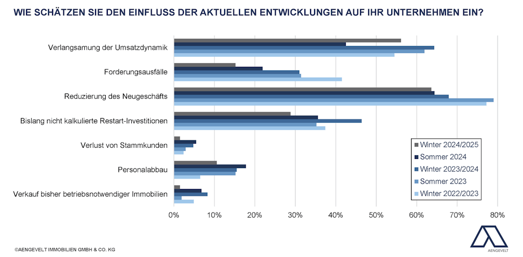 An zweiter Stelle kommen die Befürchtungen vor einer abgeschwächten Umsatzdynamik. Hier gab es sogar eine Trendumkehr: Ging der Anteil der Befragungsteilnehmer im Sommer 2024 gegenüber Winter 2023/24 (64,3 %) zunächst deutlich um nahezu 22 Prozentpunkte auf 42,5 % zurück, stieg der Anteil in der Winterbefragung 2024/25 wieder deutlich um rd. 14 Prozentpunkte auf rd. 56 % (Sommer 2024: 42,5 %) an. Hierin spiegelt sich eine durchaus kritischere Einschätzung hinsichtlich der zukünftigen Marktentwicklung wider als noch im Sommer.