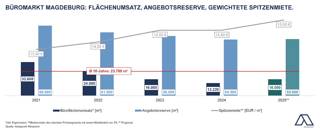 Hintergrund für diese Entwicklung: Zum einen war der Magdeburger Büromarkt vorrangig von kleinteiligen Büroflächenabschlüssen geprägt. Zum anderen kamen mehrere größerflächige Mietvertragsverhandlungen im hohen vierstelligen Quadratmeter-Bereich nicht mehr in 2024 zum Abschluss. Aengevelt geht davon aus, dass dies im ersten Quartal 2025 erfolgt. - Entsprechend prognostiziert Aengevelt Research für 2025 ein starkes erstes Quartal und bis zum Jahresende einen anziehenden Büroflächenumsatz um 16.000 m².