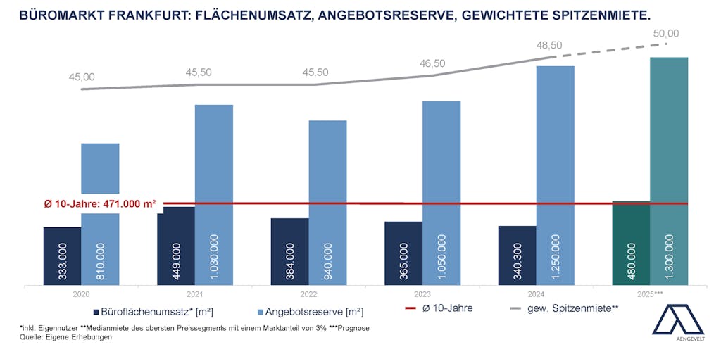 - Für 2025 prognostiziert Aengevelt Research einen Anstieg des Büroflächenumsatzes auf rd. 480.000 m². Das wäre der höchste Umsatz der jüngsten sechs Jahre, der dann auch erstmals wieder das Niveau des Zehnjahresmittels erreichen würde.