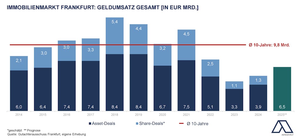 - Nach Analysen von Aengevelt Research stieg der Geldumsatz am Frankfurter Grundstücksmarkt im Jahr 2024 um 18 % auf rd. EUR 5,2 Mrd. (2023: EUR 4,4 Mrd.). Allerdings liegt dieses Ergebnis immer noch rd. 47 % unter dem Mittelwert der jüngsten zehn Jahre (Ø 2014 - 2023: EUR 9,8 Mrd.).