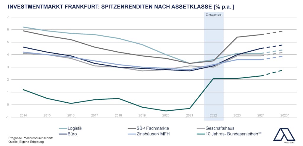- So stiegen die Spitzenrenditen 2024 für reine Büroobjekte in Frankfurter Top-Lagen um 50 Basispunkte auf 4,5 % p.a. und für SB- und Fachmärkte um 20 Basispunkte auf 5,6 % p.a.