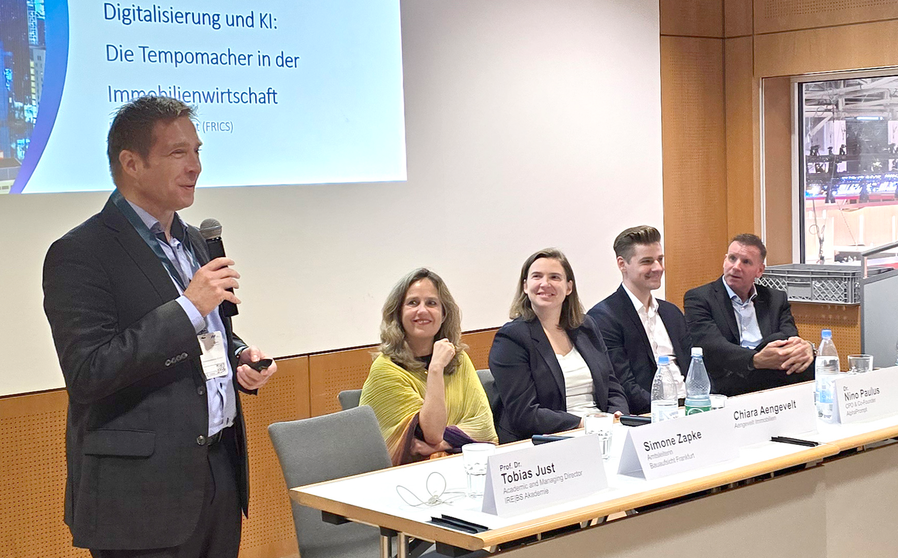 Teilnehmer der Podiumsdiskussion (von links): Prof. Dr. Tobias Just, IRE|BS, Simone Zapke, Amtsleiterin Bauaufsicht Frankfurt a.M., Chiara Aengevelt, geschäftsführende Gesellschafterin Aengevelt Immobilien, Dr. Nini Paulus, CPO & Co-Founder AlphaPrompt, Ralf Siefen, CEO Data Center Group.