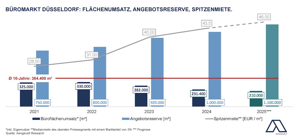 - Entsprechend prognostiziert Aengevelt Research für das Gesamtjahr 2025 einen Büroflächenumsatz von rd. 210.000 m² für die Region Düsseldorf. Dies wäre im Vergleich zum Vorjahr ein Rückgang um rd. 9 % (2024: rd. 231.400 m²), gegenüber dem Dekadenmittel (Ø 2015 - 2024: 364.400 m² p. a.) wären es rd. 42 % weniger.