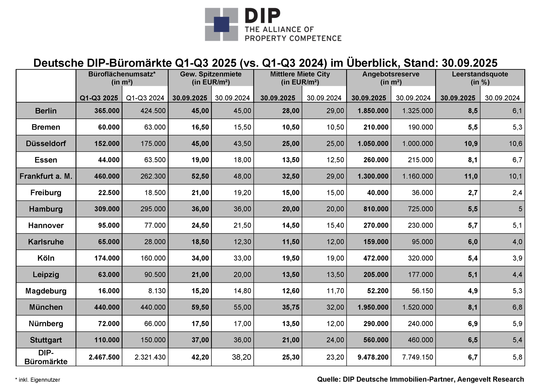 - Die Angebotsreserve in den DIP-Märkten erhöhte sich innerhalb eines Jahres um rd. 1,73 Mio. m² bzw. rd. 22 % auf aktuell rd. 9,48 Mio. m² (Ende Q3 2024: 7,75 Mio. m². Die Leerstandsquote stieg von 5,8 % im dritten Quartal 2024 auf nun 6,7 %.