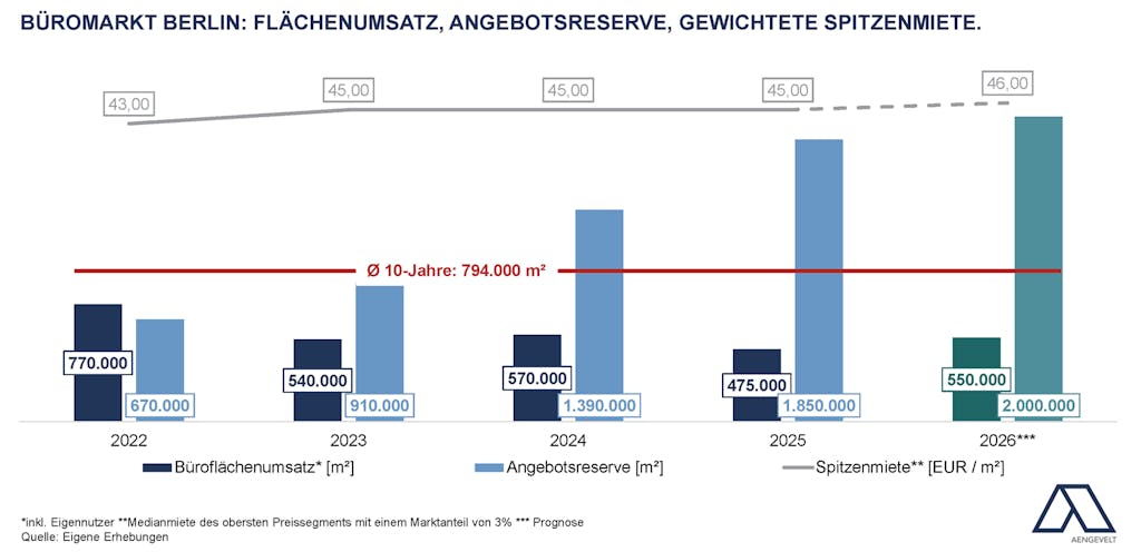- Dieser Trend setzte sich im Jahresverlauf 2025 nochmals deutlich fort: Anfang 2026 stellt sich die Angebotsreserve in Berlin nach Analysen von Aengevelt Research auf rd. 1.850.000 m².