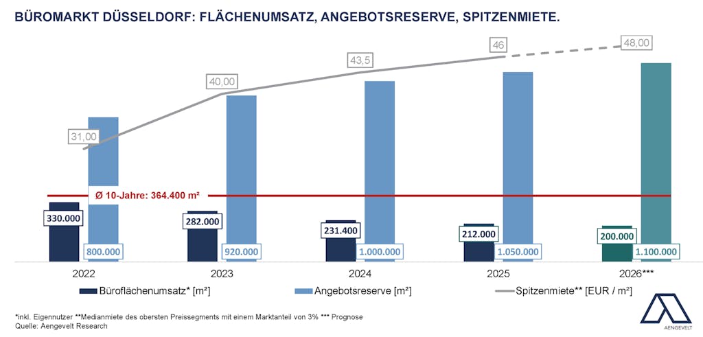 - Für 2026 prognostiziert Aengevelt Research einen nochmals moderat rückläufigen Büroflächenumsatz um 200.000 m².