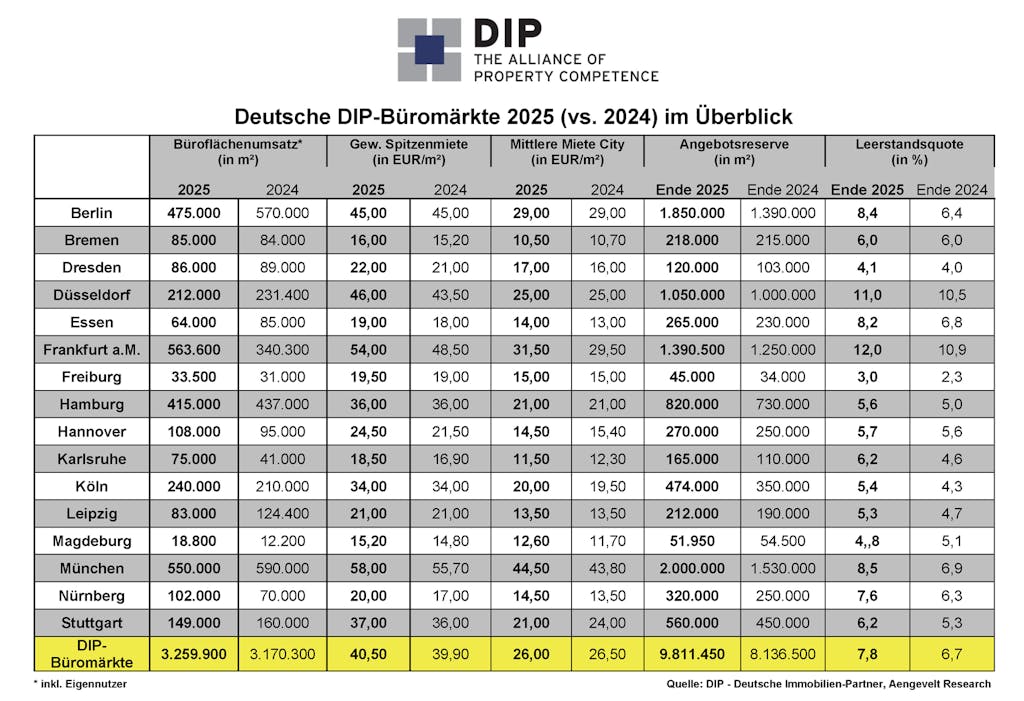 Die Analysen von DIP – Deutsche Immobilien-Partner belegen für 2025 eine im Vergleich zum Vorjahr insgesamt stabile Vermietungsdynamik am deutschen Büromarkt: