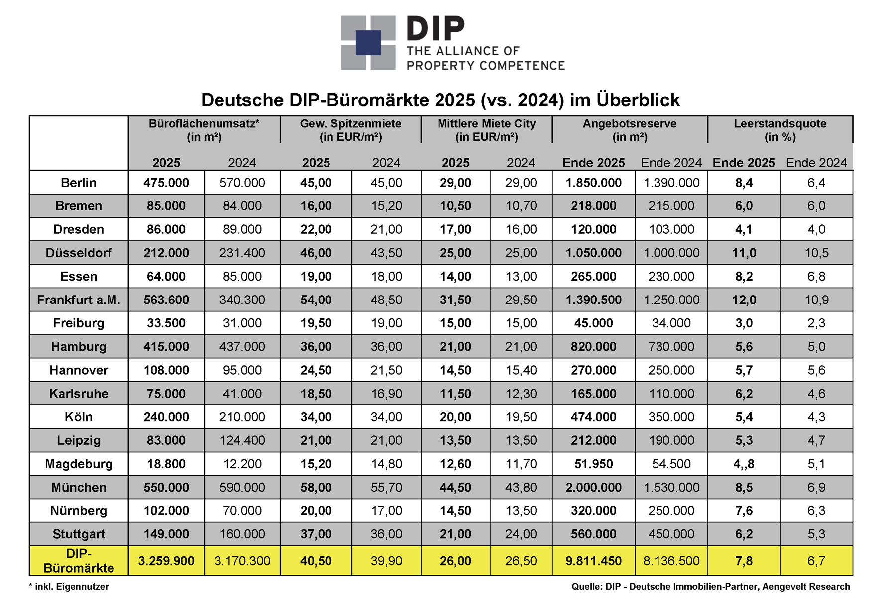 - 2025 ist der Gesamtbüroflächenleerstand in den DIP-Büromärkten weiter markant um rd. 1,68 Mio. m² gestiegen und stellt sich Anfang 2025 auf rd. 9,8 Mio. m² (Anfang 2025: 8,1 Mio. m²).