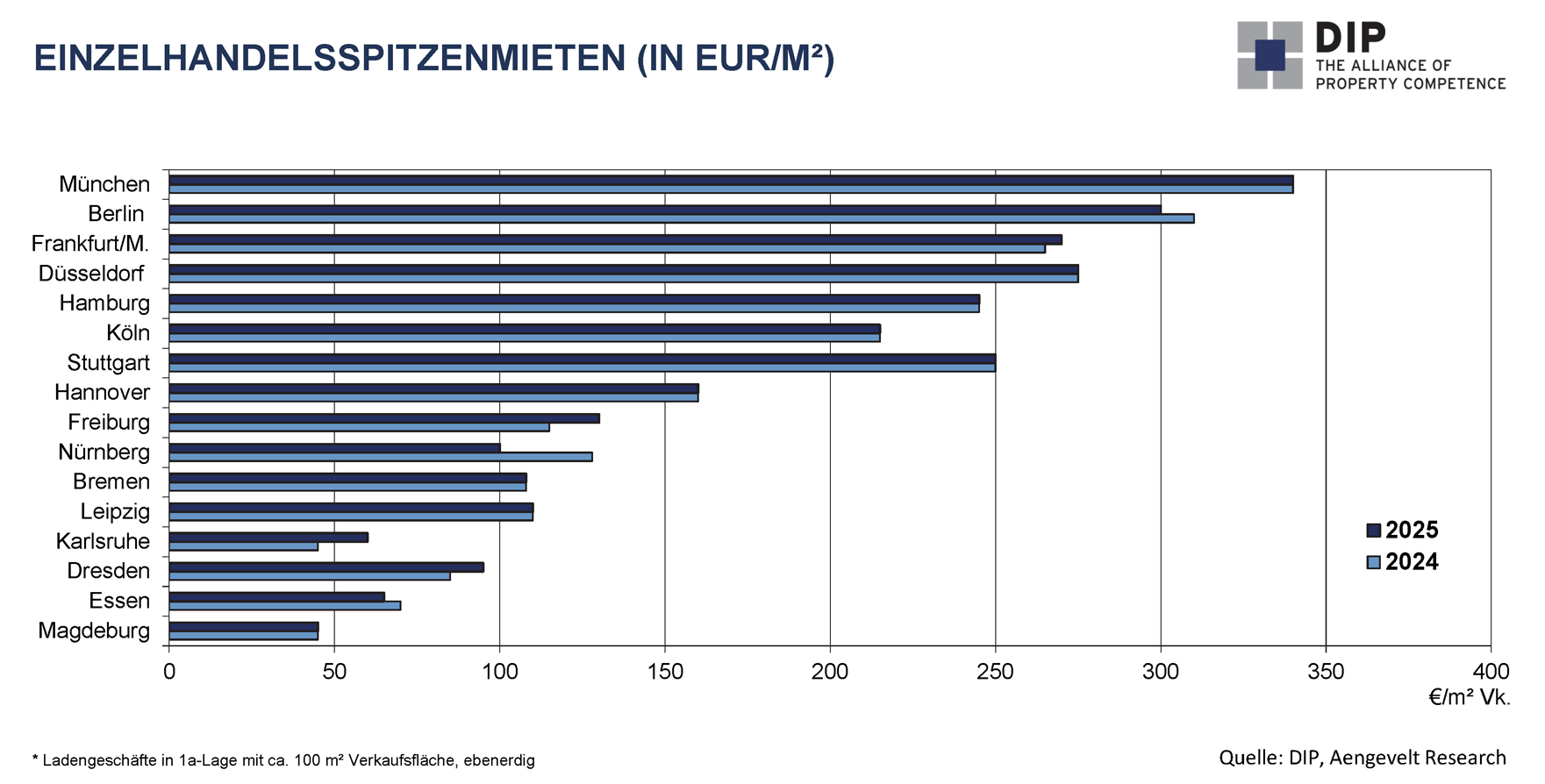 Gleichzeitig blieb die über alle von DIP analysierten Standorte gemittelte Spitzenmiete für Top-Einzelhandelsflächen stabil. In den Einzelmärkten gab es indessen differenzierte Entwicklungen.