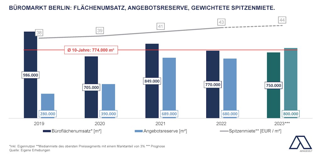 - Für 2023 prognostiziert Aengevelt Research indessen eine markante Erhöhung der Angebotsreserve um rd. 120.000 m² auf ein Volumen von plus / minus 800.000 m².