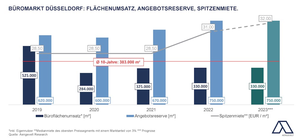 - Für 2023 prognostiziert Aengevelt Research eine Stabilisierung der Angebotsreserve bei etwa 750.000 m².