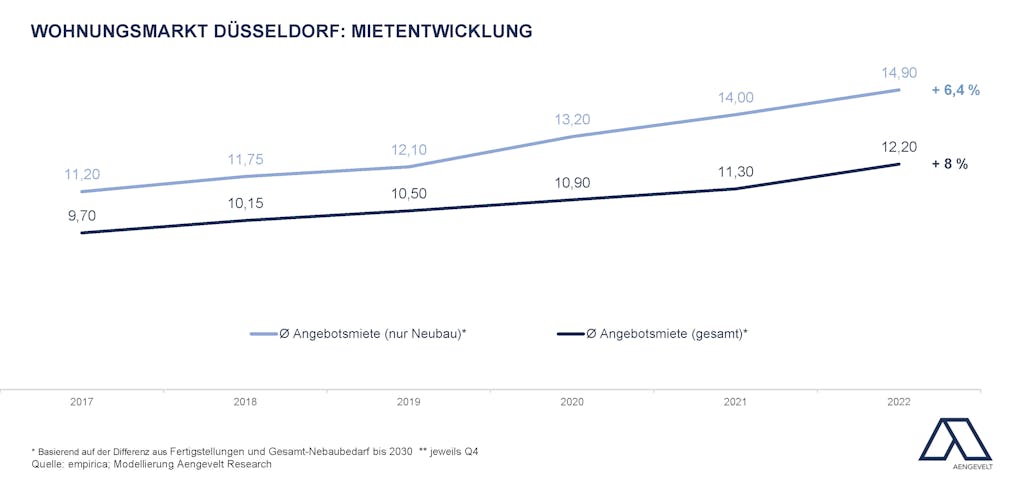 - Addiert man den hieraus abgeleiteten Neubaubedarf mit dem aktuellen (nominellen) Wohnungsdefizit (rd. 4.700 Wohnungen) sowie dem Mindesterhaltungsbedarf “neu gegen alt“ in Höhe von rd. 0,5% p.a. des Gesamtwohnungsbestandes (rd. 353.700 WE = rd. 1.770 WE p.a.), ergibt sich daraus ein Gesamtneubaubedarf von rd. 4.7450 Wohnungen, die pro Jahr in Düsseldorf gebaut werden müssten.