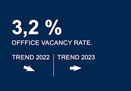 Contrary to the trend since 2020, the nominal supply reserve declined slightly in the year under review. In 2022, the citywide vacancy rate fell slightly to 3.2% (2021: 3.3%) and now stands at around 680,000 sqm of office space.