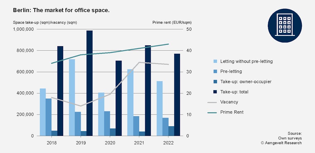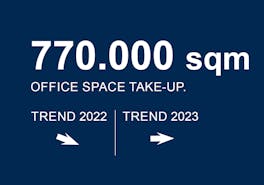 The economic uncertainty made itself felt on the Berlin office market, with take-up of around 770,000 sqm achieved in 2022. This was around 9% below the previous year's result (2021: 849,000 sqm) and just below the most recent ten-year average (Ø 2012 - 2021: 773,700 sqm p.a.) with a delta of minus around 0.5%.