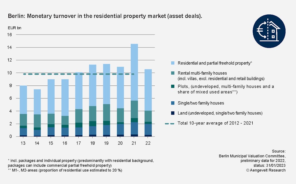 The transaction volume from conventional sales (asset deals) of residential land, residential properties (excluding residential and commercial properties with more than 20% commercial share) and residential or part-ownership declined by 27.4% year-on-year to around EUR 10.5 billion in 2022 (2021: EUR 14.5 billion), according to preliminary analysis results from the Berlin Expert Committee.