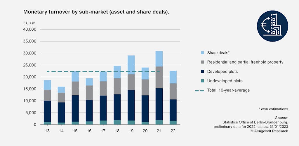 In addition to the asset deals, there is also a considerable share deal volume of around EUR 5.3 billion. The total transaction volume achieved in the Berlin real estate market in the reporting year 2022 thus amounts to around EUR 22.6 billion.