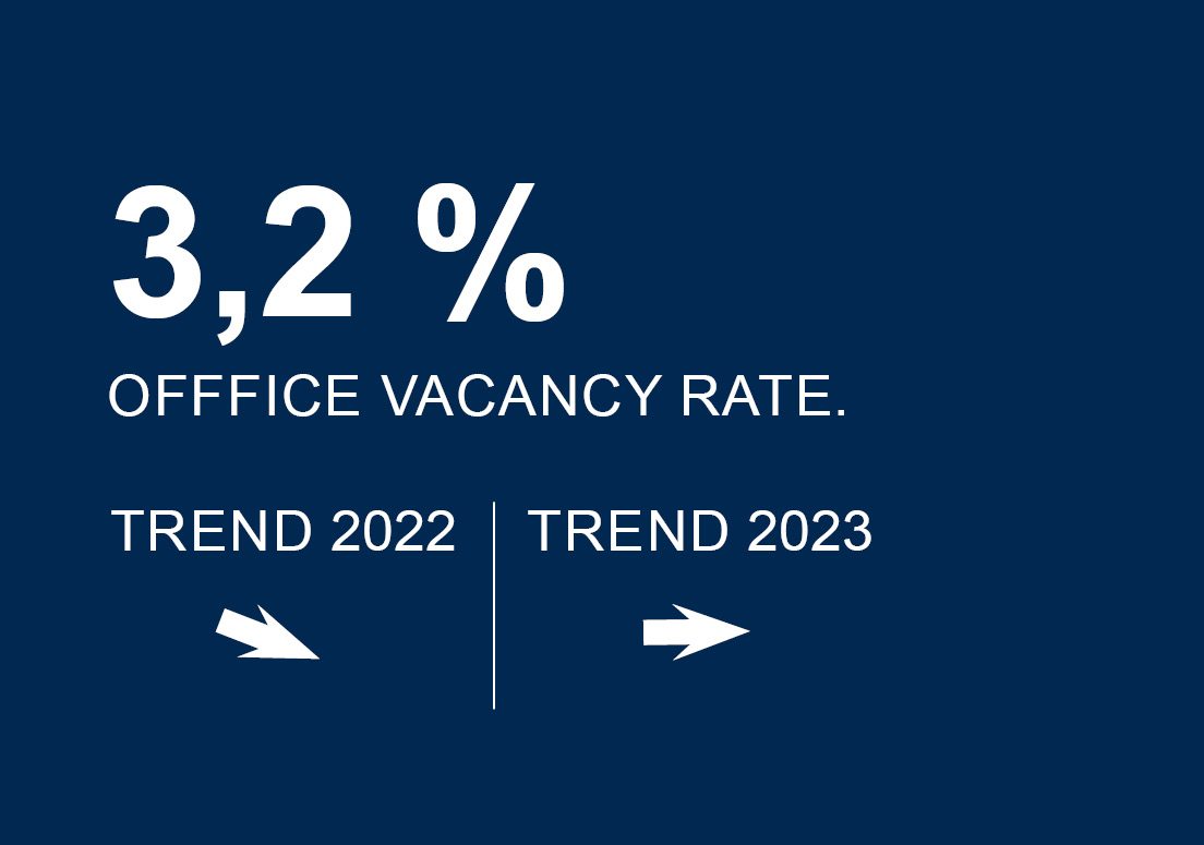 Contrary to the trend since 2020, the nominal supply reserve declined slightly in the year under review. In 2022, the citywide vacancy rate fell slightly to 3.2% (2021: 3.3%) and now stands at around 680,000 sqm of office space.