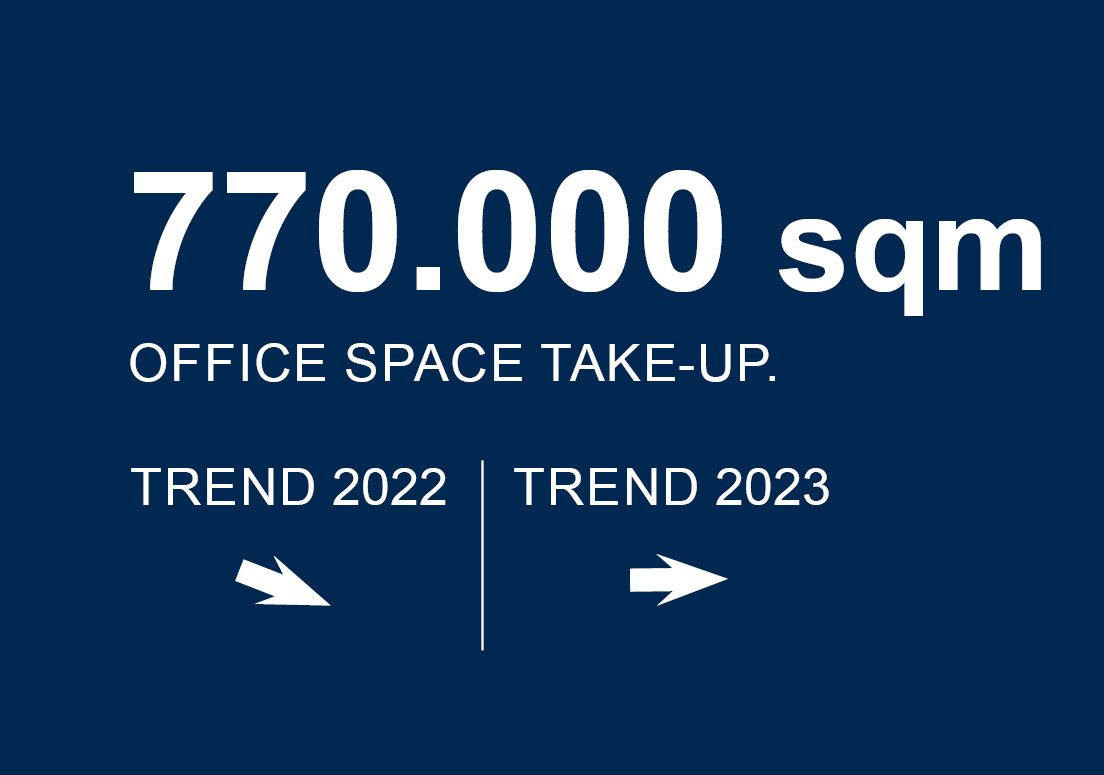 The economic uncertainty made itself felt on the Berlin office market, with take-up of around 770,000 sqm achieved in 2022. This was around 9% below the previous year's result (2021: 849,000 sqm) and just below the most recent ten-year average (Ø 2012 - 2021: 773,700 sqm p.a.) with a delta of minus around 0.5%.
