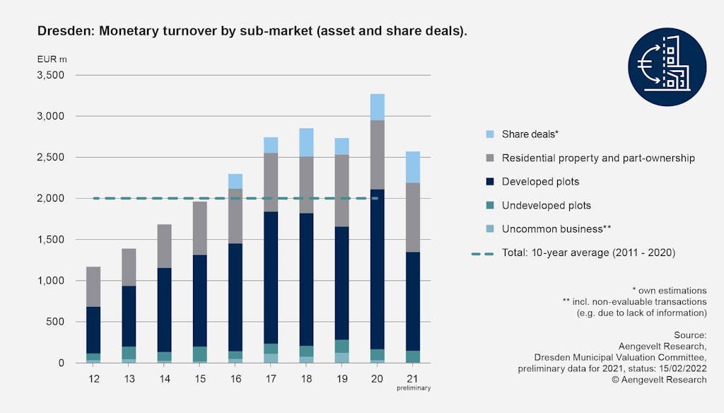 In the reporting year 2022, the transaction volume of all land and real estate traded in Dresden amounted to approximately EUR 2.19 billion (asset deals including transactions of unusual business transactions), thus the result from the previous year was repeated almost exactly (2021: EUR 2.19 billion). This year's result was only around 0.1% or EUR 3 million higher. In a ten-year comparison (average 2012 - 2021: EUR 2.11 billion), the result is around 3.9% or EUR 83 million above the average. In addition to conventional market activities, there are also share deals with a transaction volume of around EUR 320 million (2021: EUR 380 million), which has fallen by around EUR 60 million or 15.8% within a year. Total sales in the reporting year thus amount to around EUR 2.51 billion (2021: EUR 2.57 billion).