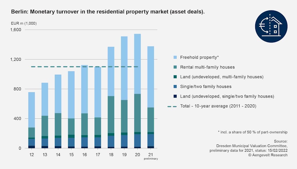 According to preliminary evaluations by the GAA Dresden, the transaction volume on the overall residential market in Dresden (undeveloped, developed, residential and part-owned) amounted to around EUR 1.34 billion. This was around 2.9% down on the previous year (2021: EUR 1.38 billion), but around 14.5% above the long-term average (Ø 2012 - 2021: around EUR 1.17 billion).