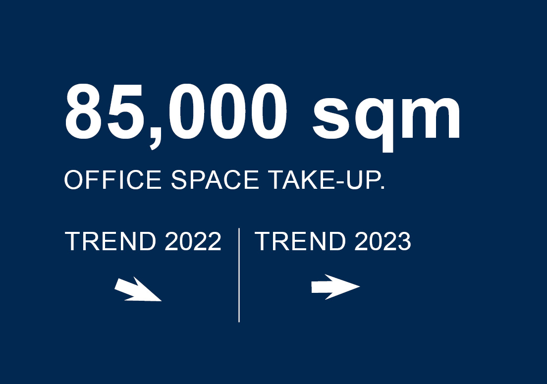 In the year under review, 68,300 m² of office space was completed, more than twice as much as in the previous year. The level is thus once again significantly higher than that of the past decade (average 2012 - 2021: 21,000 m²).