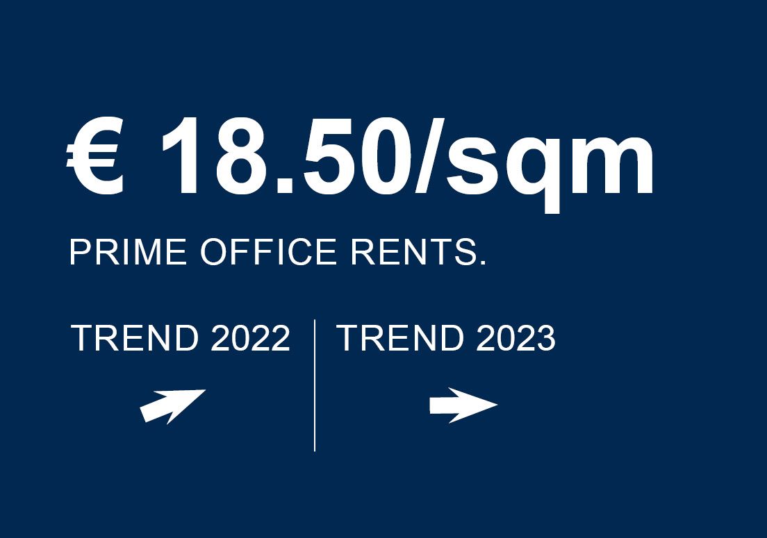 Median rents in city center locations have risen to a current EUR 15.00/m². The adjacent city periphery is also showing a positive trend for new leases and will average EUR 12.00/m² in 2022 (2021: around EUR 11.00/m²).