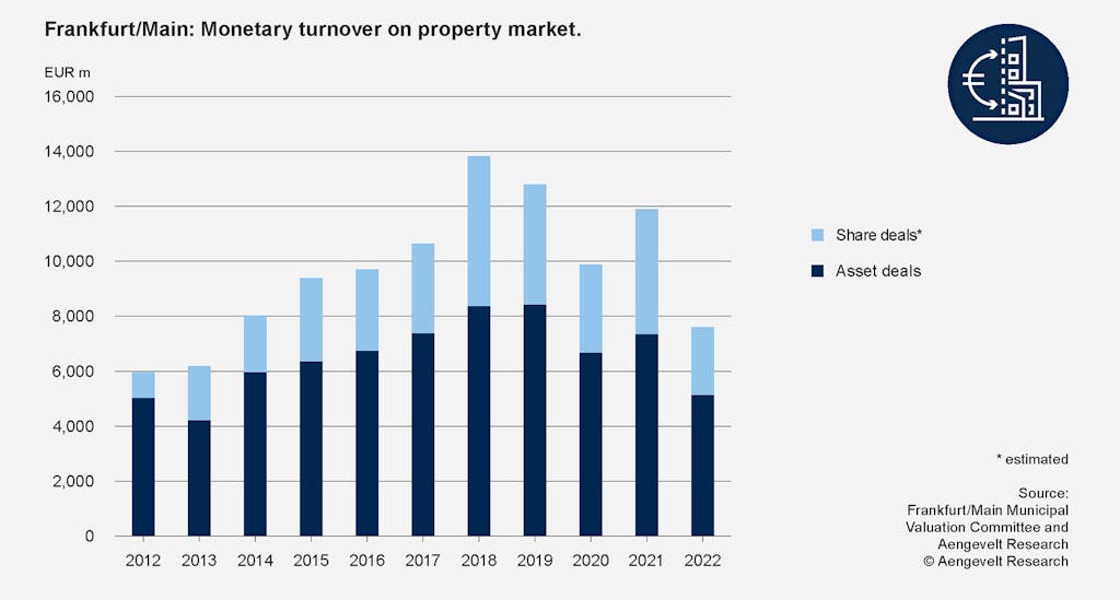 With a transaction volume from conventional real estate sales (exclusively asset deals) of EUR 5.1 billion, not only was the previous year's result significantly undercut by 30% (2021: EUR 7.3 billion), but the ten-year average was also missed by around 23% (average 2012 - 2021: EUR 6.7 billion).