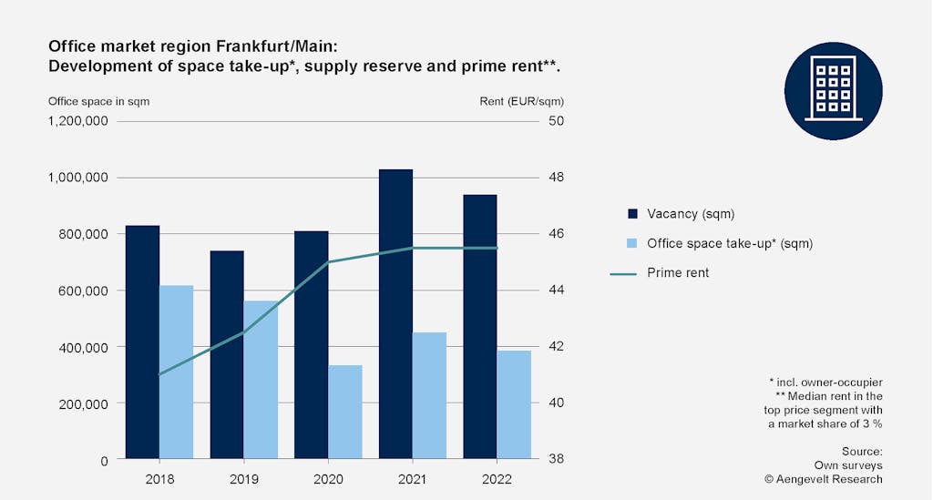 Office market region Frankfurt/Main: Development of space take-up, supply reserve and prime rent.