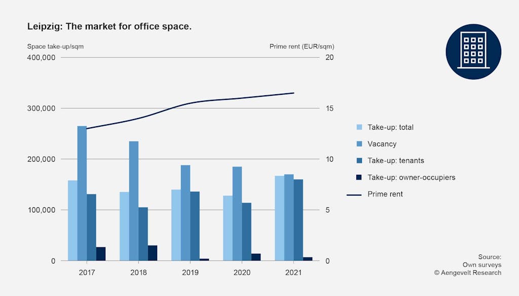 The lack of demand-driven space in central Leipzig resulted in the weighted prime rent rising to EUR 17.50/m². The shortage in central locations within the city center "ring" is benefiting the city's other office locations, which is also accompanied by an increase in average rents here. Irrespective of this, the general level of rents continues to be friendly to new business, so that in terms of office costs the success story of the "young" and growing city of Leipzig can continue.