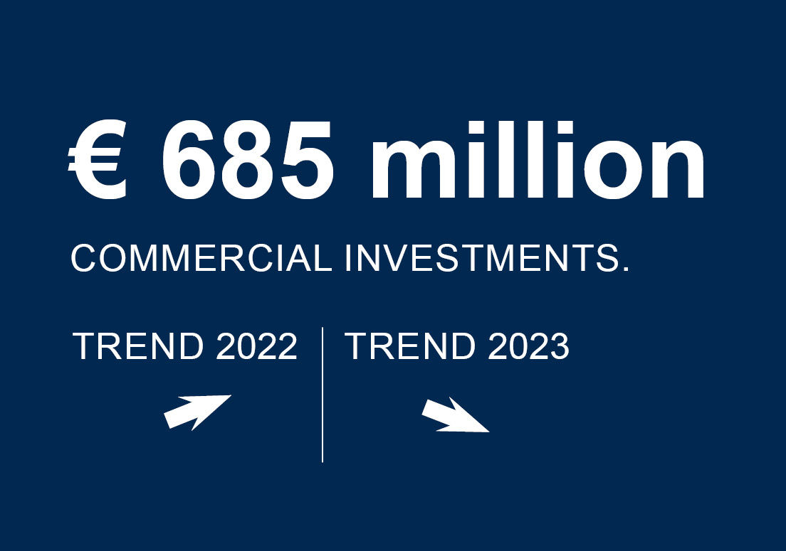 Cash turnover for building land amounted to around EUR 149.5 million in 2022, clearly missing the previous year's result by around 43% (2021: EUR 261.9 million). The average value for the most recent decade was undercut by 16%. Sales of undeveloped commercial space (asset, pure commercial) amounted to around EUR 19.1 million in the reporting year, 13.4% below the decade average (average 2012 - 2021: EUR 22.1 million).