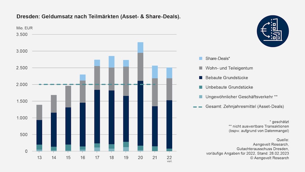 Im Berichtsjahr 2022 belief sich das Transaktionsvolumen aller in Dresden gehandelten Grundstücke und Immobilien auf rd. EUR 2,19 Mrd. (Asset Deals inklusive Transaktionen des ungewöhnlichen Geschäftsverkehrs), damit wurde das Ergebnis aus dem Vorjahr beinahe punktgenau wiederholt (2021: EUR 2,19 Mrd.). Lediglich rd. 0,1 % bzw. EUR 3 Mio. fiel das Ergebnis dieses Jahr höher aus. Im Zehnjahresvergleich (Ø 2012 - 2021: EUR 2,11 Mrd.) liegt das Ergebnis rd. 3,9 % bzw. EUR 83 Mio. über dem Mittelwert. Ergänzend zum konventionellen Marktgeschehen treten noch die Gesellschaftsanteilsverkäufe (Share-Deals) hinzu mit einem binnen Jahresfrist um EUR rd. 60 Mio. bzw. 15,8 % gesunkenem Transaktionsvolumen in Höhe von rd. EUR 320 Mio. (2021: EUR 380 Mio.). Der Gesamtumsatz summiert sich im Berichtsjahr somit auf rd. EUR 2,51 Mrd. (2021: EUR 2,57 Mrd.).